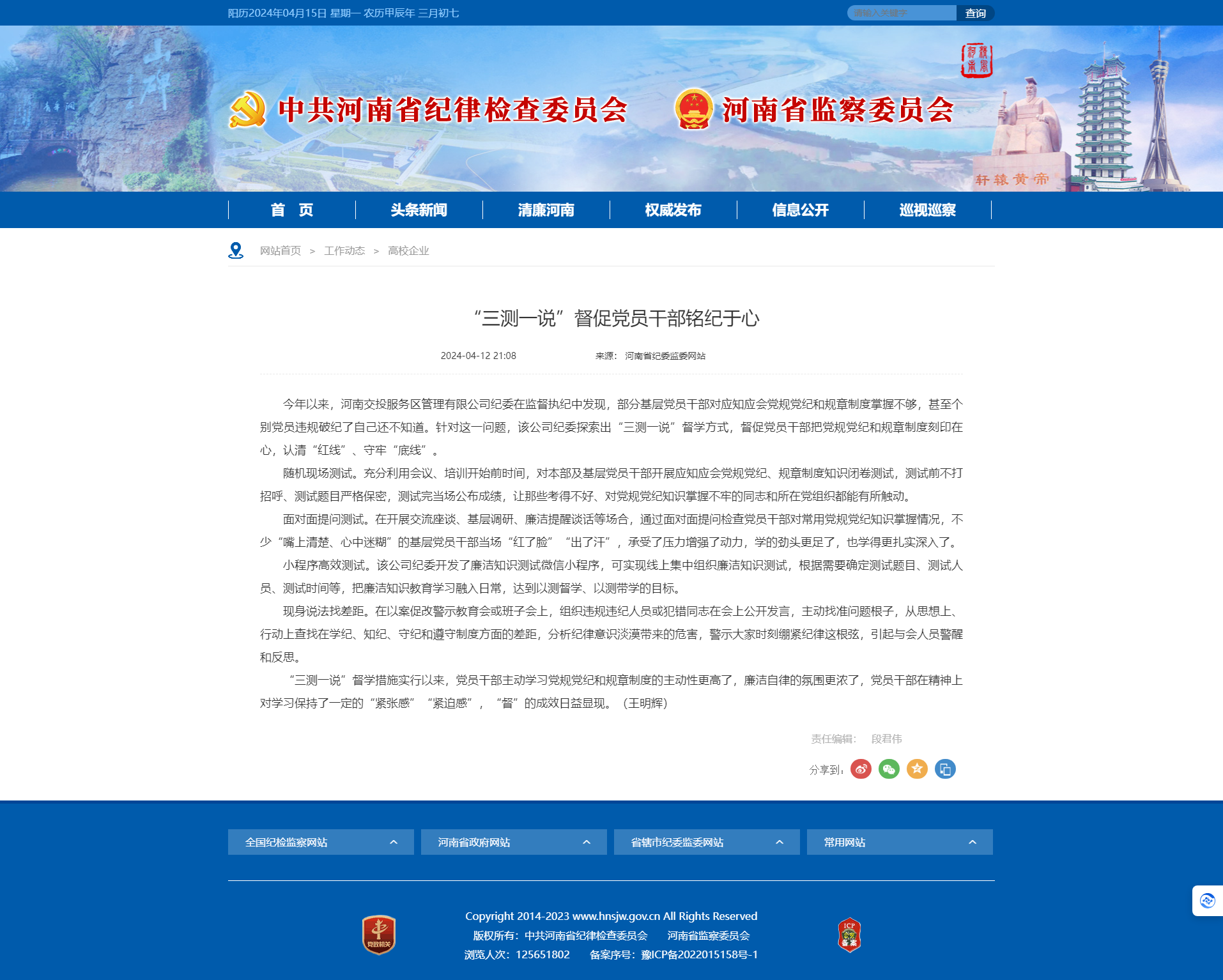 省紀(jì)委監(jiān)委網(wǎng)站刊登公司紀(jì)委文章《“三測一說”督促黨員干部銘紀(jì)于心》